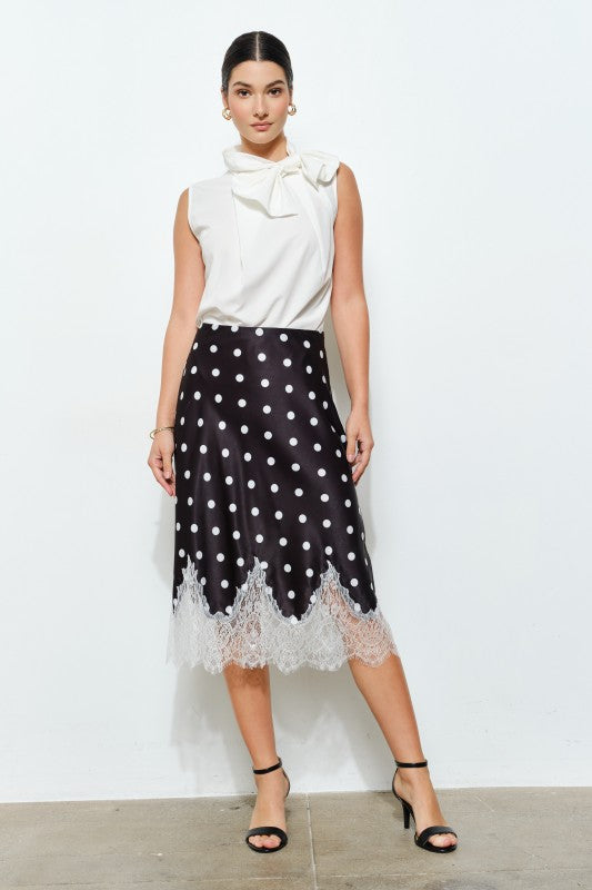 Elevate your special occasion wardrobe with this chic polka dot satin skirt featuring delicate lace contrast and a flattering H-line silhouette. The sleeveless design pairs beautifully with a bow neckline, while the playful bubble hem adds movement and personality. compromising on style. Perfect for Valentine's Day, parties, or romantic nights out, it's designed to make you feel confident and fabulous. The feminine cut ensures a flattering fit for all body types.