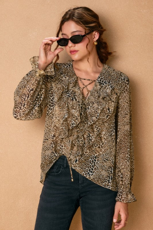 The Ash Panther Blouse is a semi-sheer statement piece that's equal parts bold and flirty. Featuring an eye-catching animal print, this blouse boasts a flattering V-neckline, ruffled chest detail, and playful lace-up front tie for customizable styling. Elastic-trimmed ruffled sleeves add movement and charm. The easy pull-on design makes getting ready a breeze.