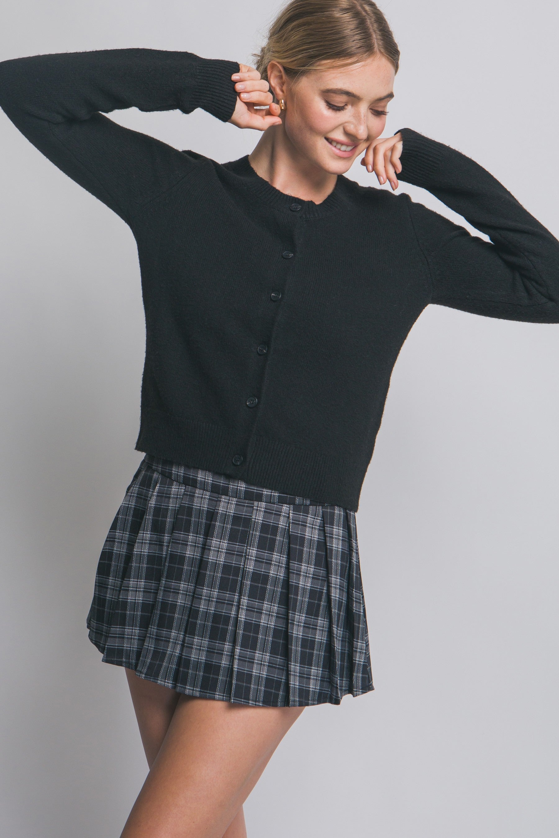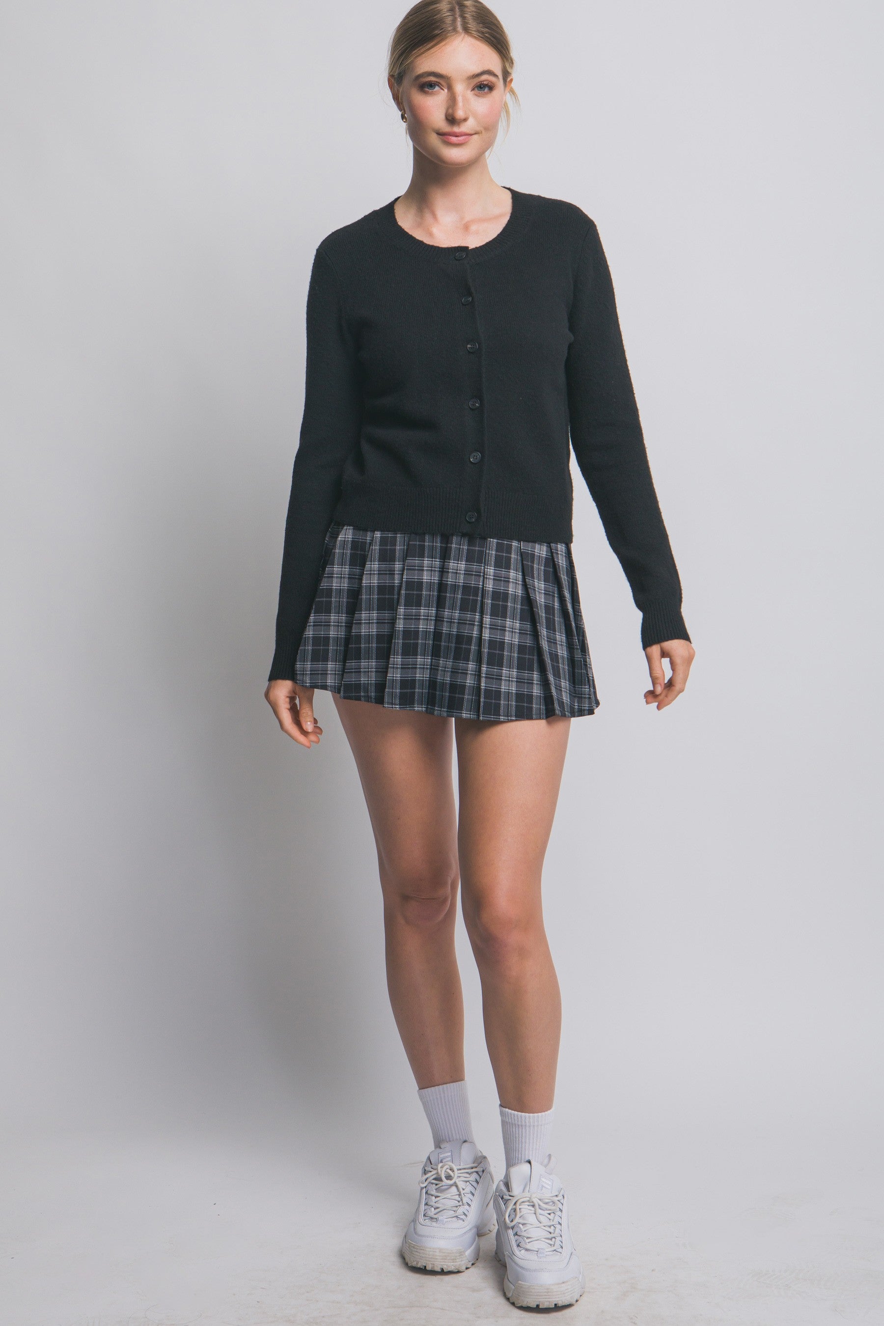 Featuring a front button closure, this cardigan also offers long sleeves and snug ribbed cuffs and hem for a comfortable, polished look.