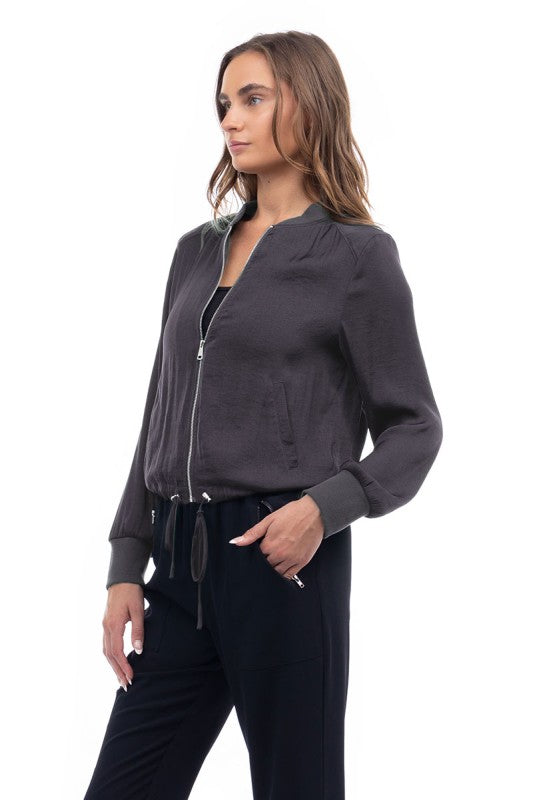 This satin jacket brings smooth shine and playful contrast with its rib-trimmed edges. The adjustable waist drawstring lets you shape your silhouette just right, blending polished vibes with a relaxed feel. Crafted from soft woven polyester and easy to care for with cold hand wash, it’s your go-to piece for effortless style with a touch of fun.