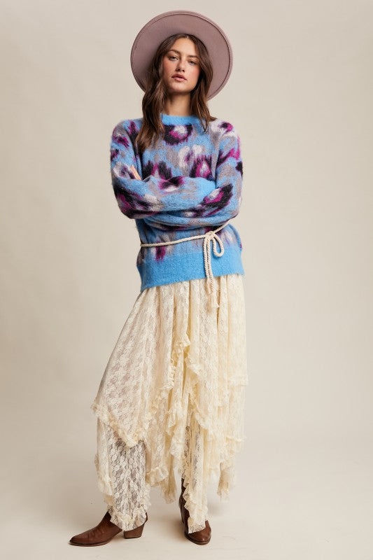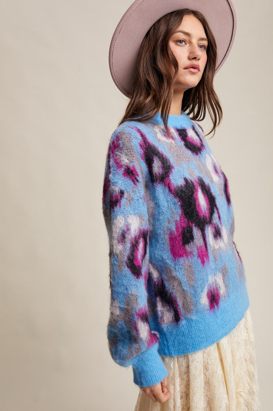 Meet your new favorite layering piece—a fuzzy pullover that's equal parts wild and wonderfully wearable. A soft brushed knit, this sweater features an abstract leopard print that pops in vibrant blues, pinks, blacks, and grays. The crew neckline and ribbed cuffs keep things polished, while the relaxed fit makes it perfect for throwing over everything in your closet.