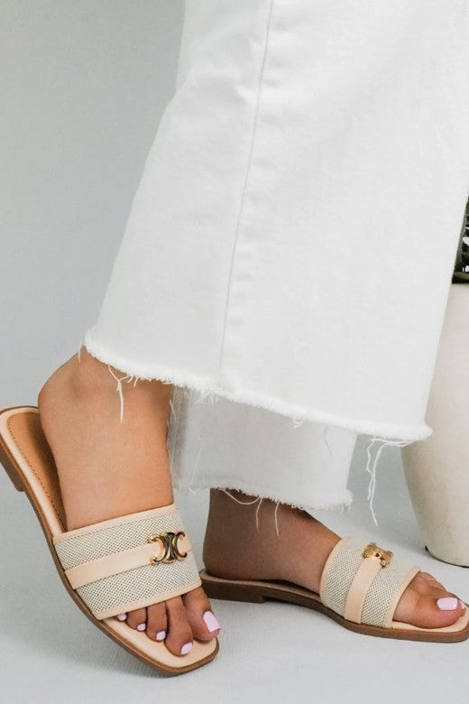 The South Beach Slide is a must have! Chic and versatile it's designed with a modern square toe and a breathable mesh upper. This style blends comfort with effortless sophistication. The dual-tone strap is accented with a gold-tone hardware. The easy slip-on design and flat sole make these sandals perfect for all-day wear, whether you're heading to brunch, running errands, or enjoying a casual outing. Lightweight and comfortable, they pair beautifully with dresses, denim, or tailored summer looks.